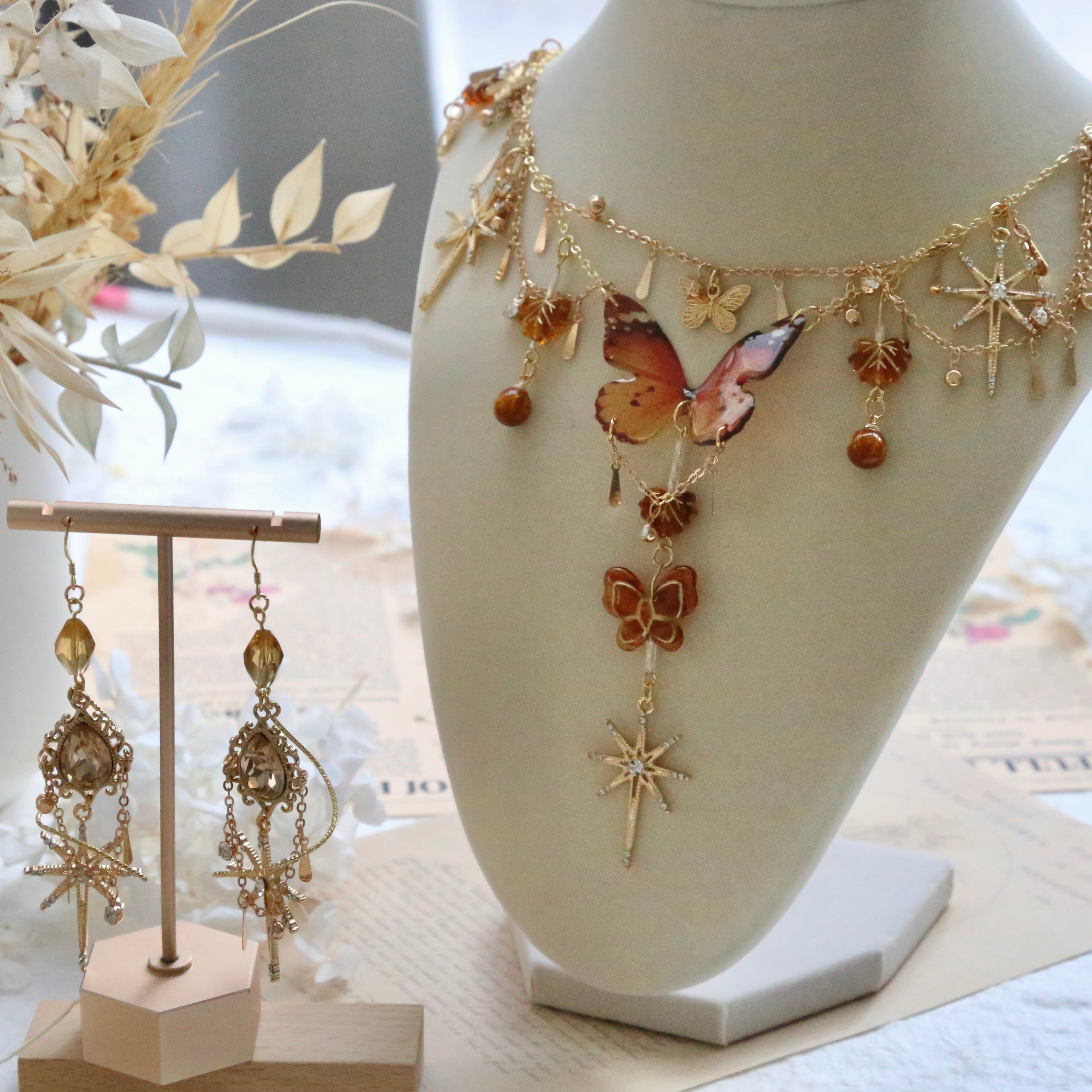 Embrace mystery and vintage charm with our Butterfly Star Set! This set includes a stainless steel necklace, perfect for sensitive skin, and matching earrings. Adorned with retro brown butterflies and vintage six-pointed stars, it’s a unique blend of elegance and mystique.