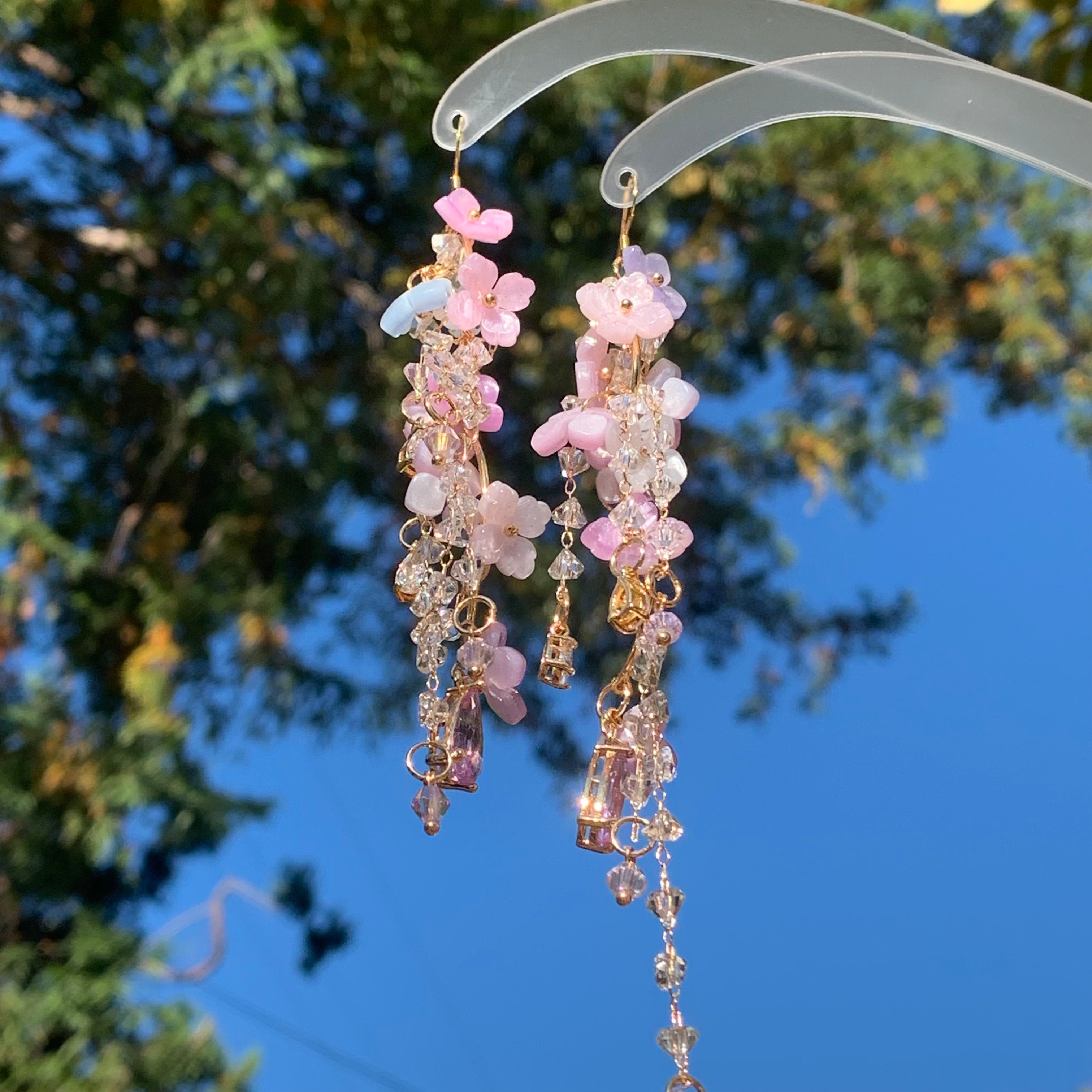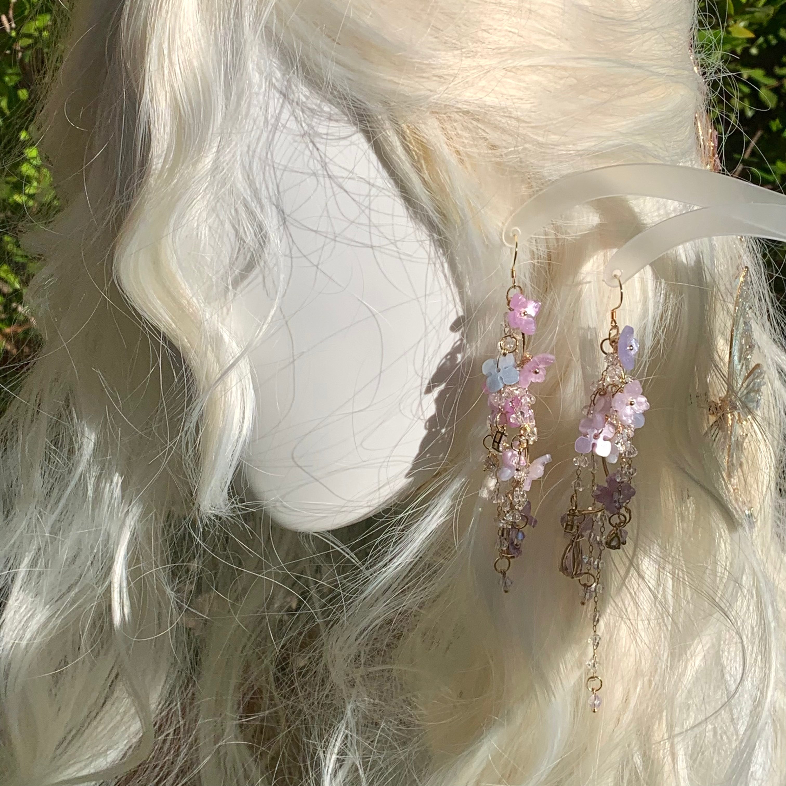 Long cascading earrings made from purple gradient hydrangea beads, lavender and clear crystals. Intricate and dreamy.