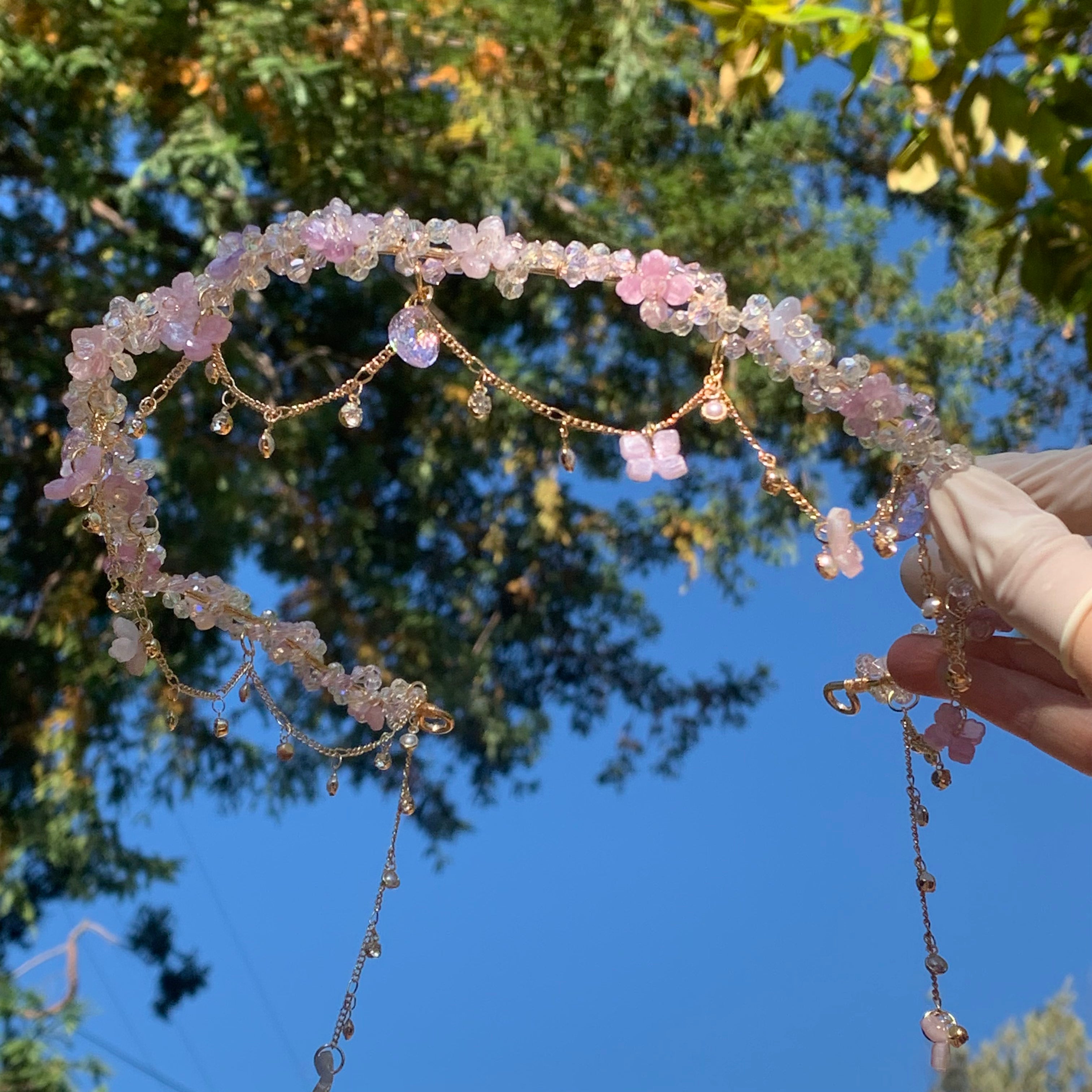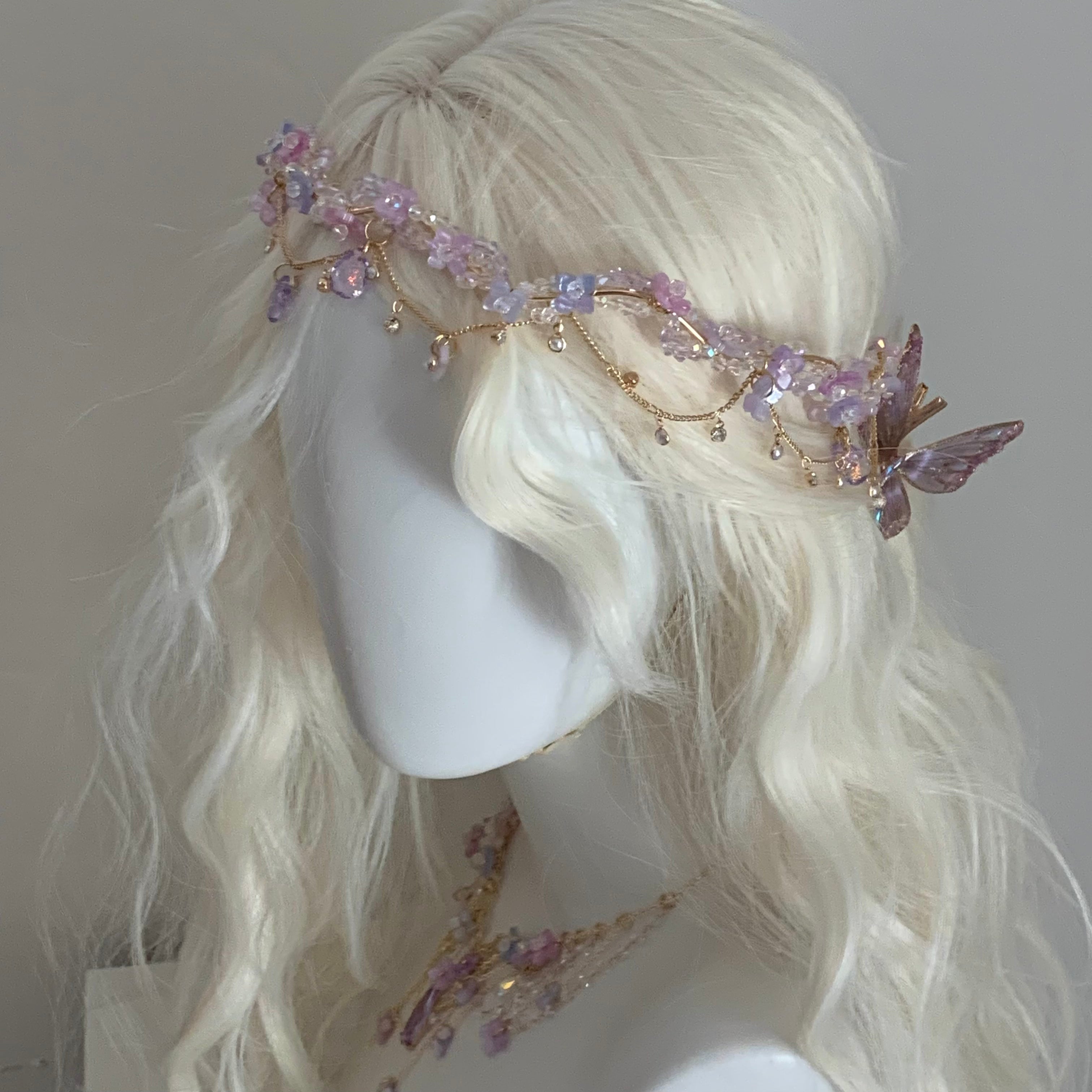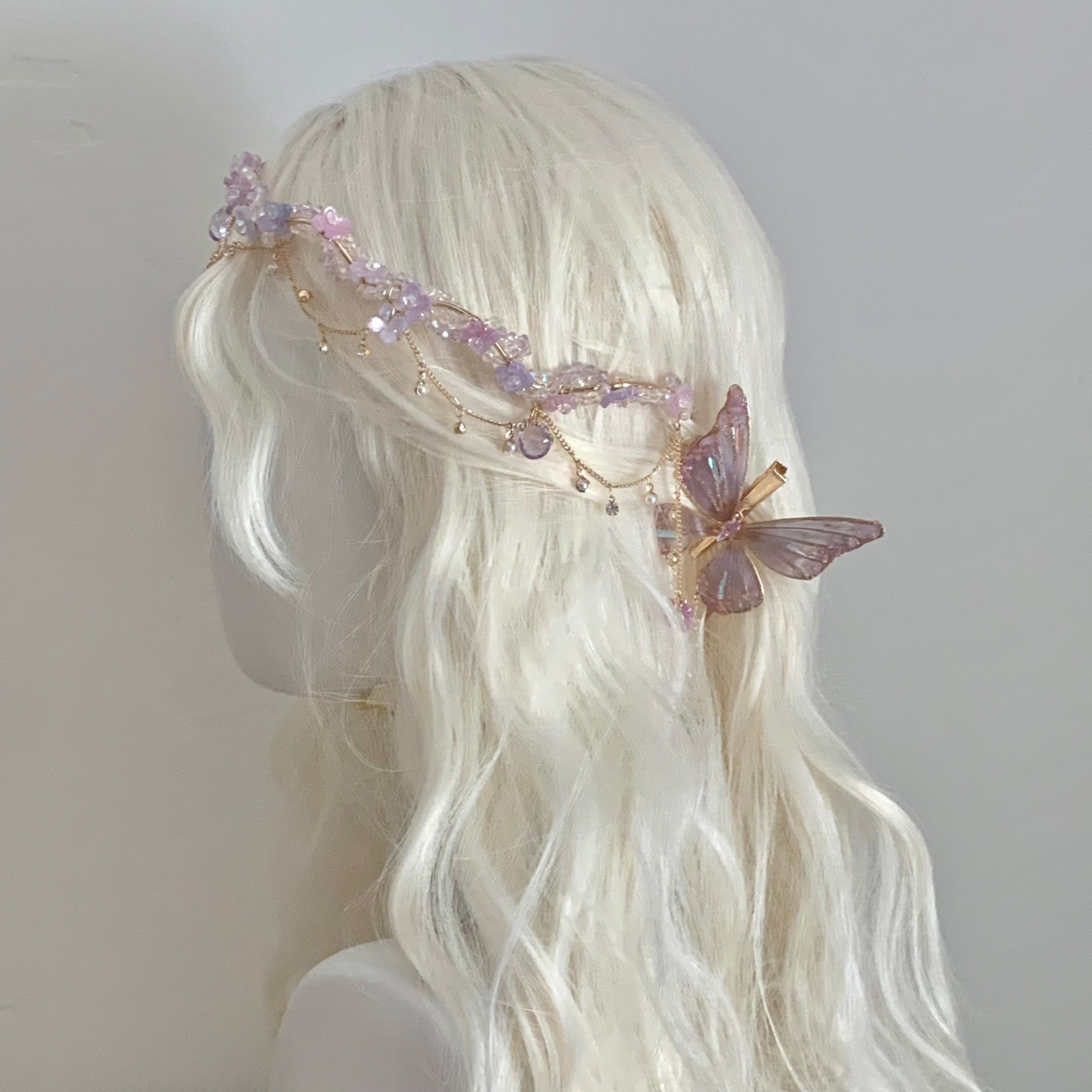 A dreamy tiara-style headband handcrafted with gradient purple hydrangea beads and delicate crystal tassels. The wavy silhouette creates a soft, fairytale look—perfect for ethereal styling.