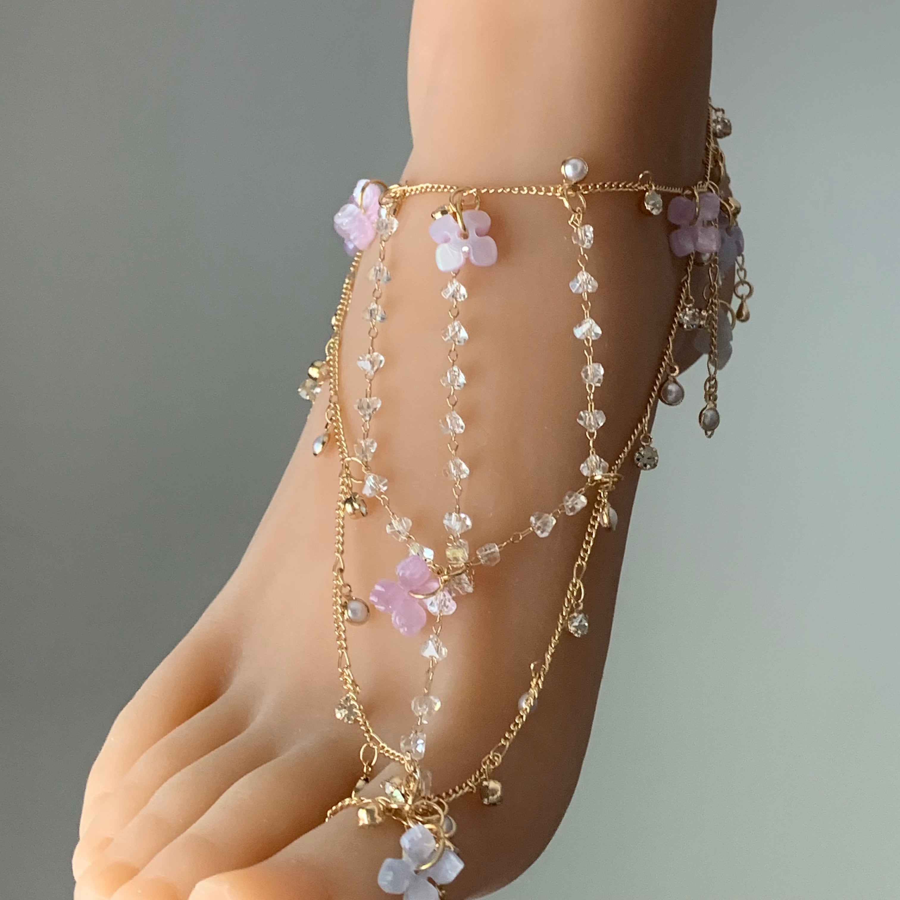 From ankle to toe, this delicate anklet wraps your foot in soft, romantic detail. Made with gradient purple hydrangea beads and glistening crystal tassels, it weaves across the ankle and down to the toe for a one-of-a-kind, ethereal silhouette—perfect for barefoot beach days, summer photoshoots, or fantasy-inspired styling. Lightweight, adjustable, and entirely handcrafted.