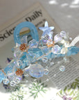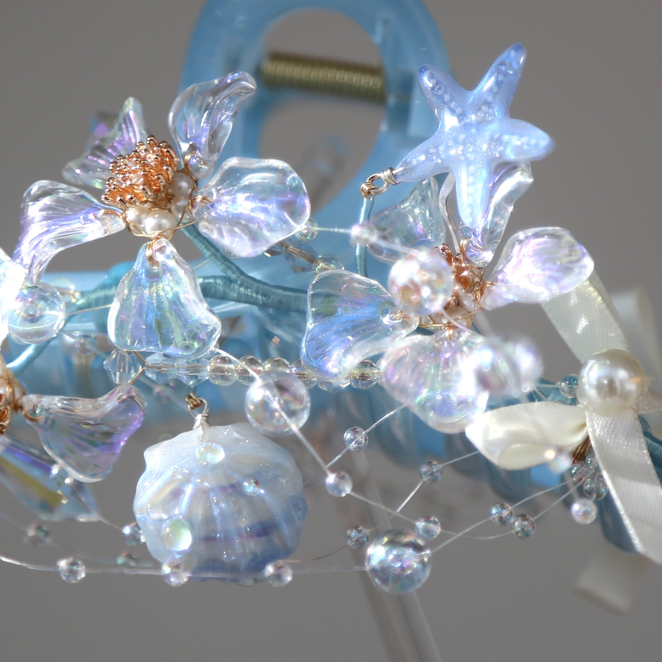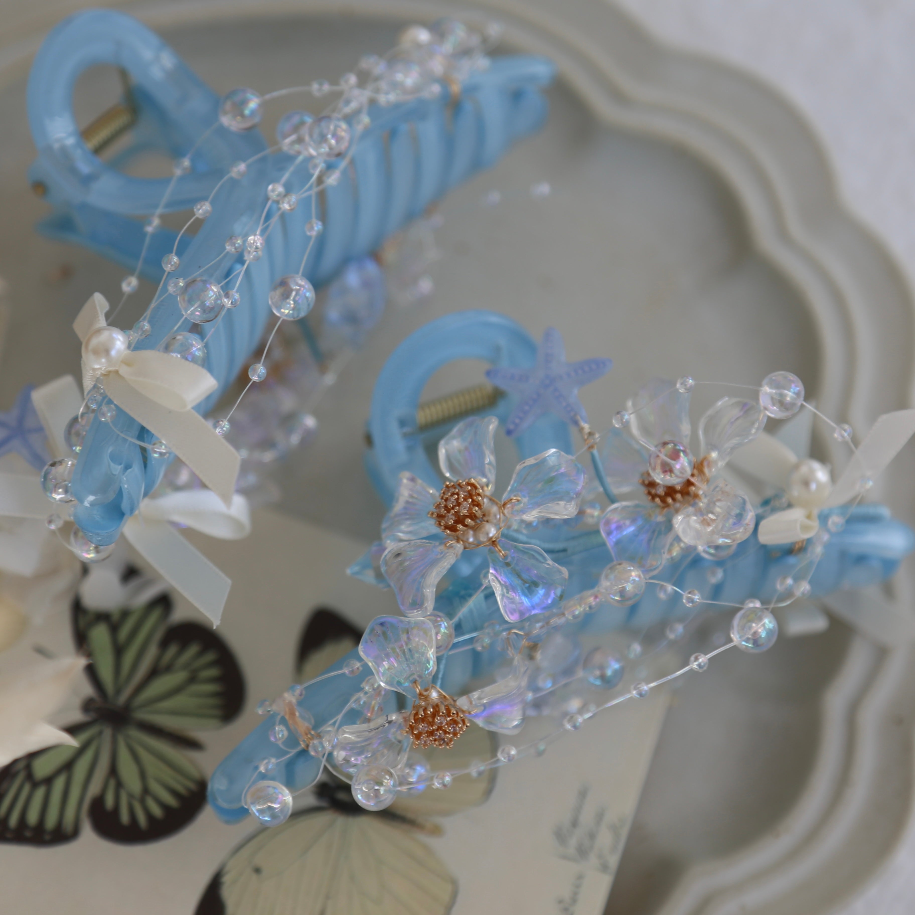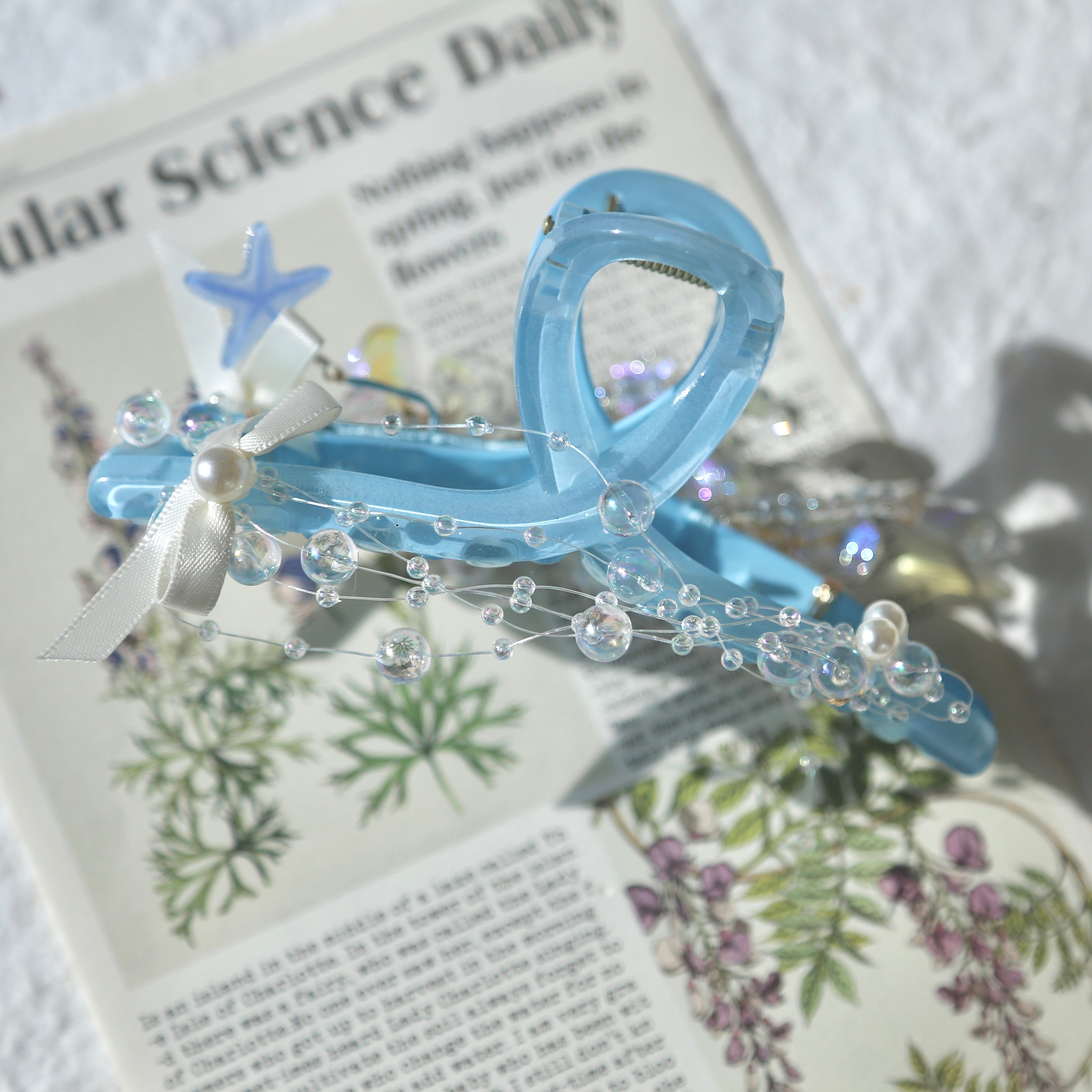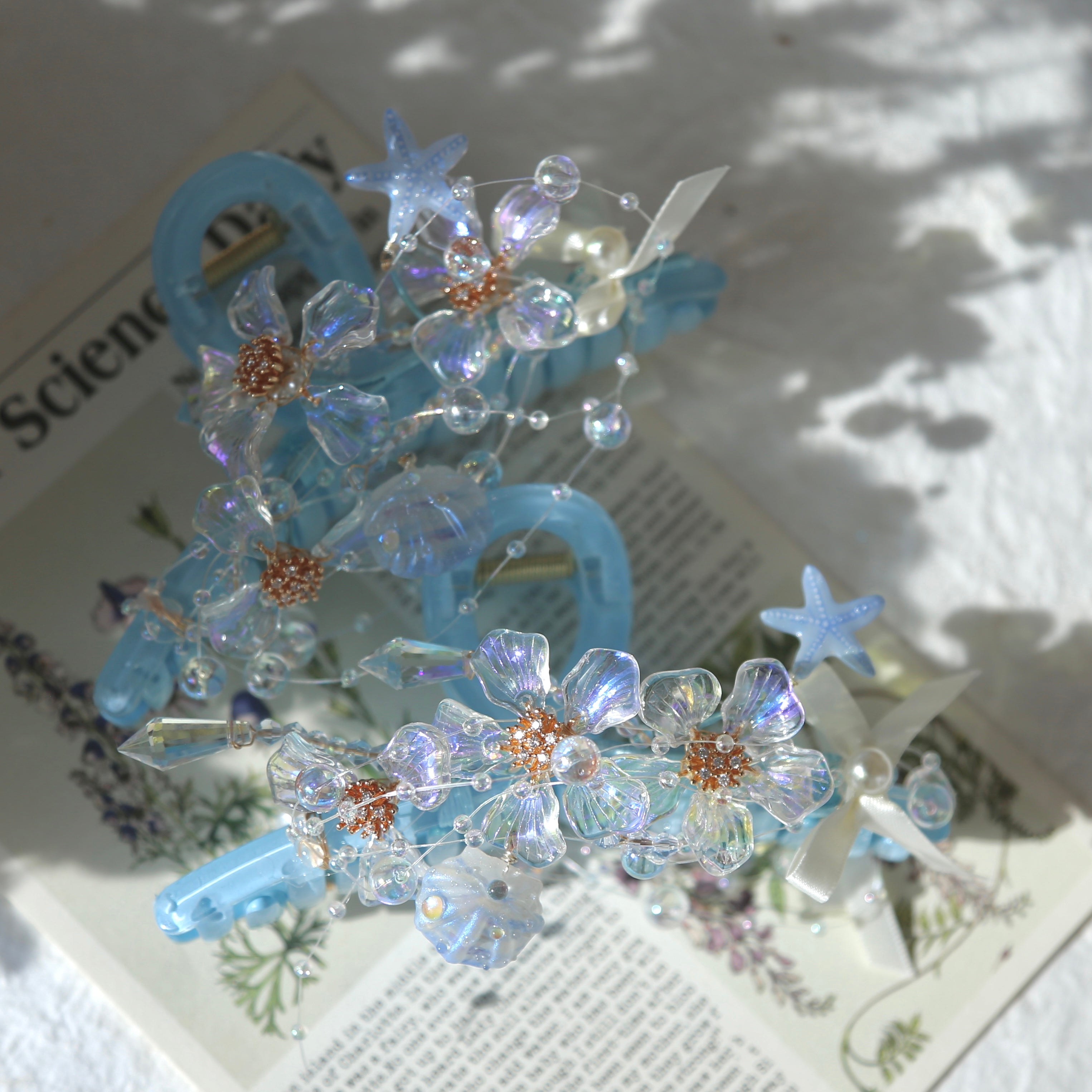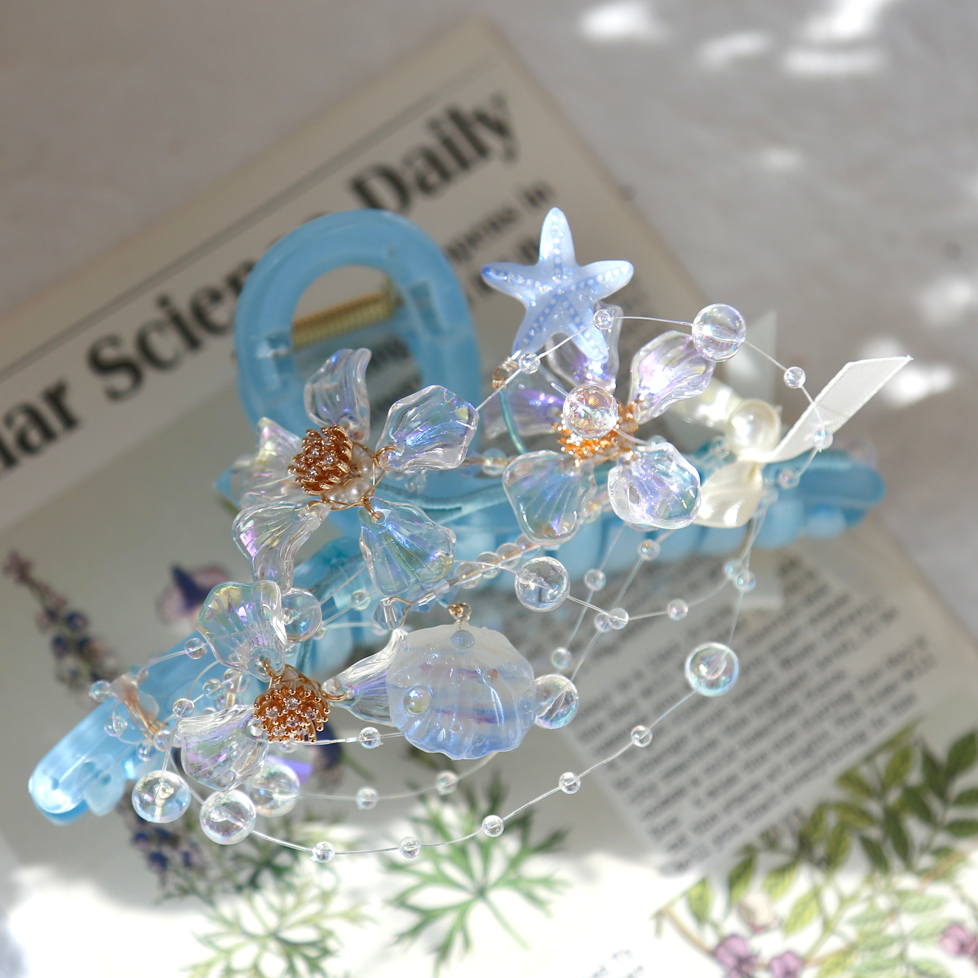 This unique handmade hair claw beautifully combines sakura flowers and ocean elements on one side, while the other features water droplets and flowing ribbons, creating a dreamy, ethereal look. The starfish and shells are carefully crafted from shrink plastic, adding a lightweight and delicate touch to the design.