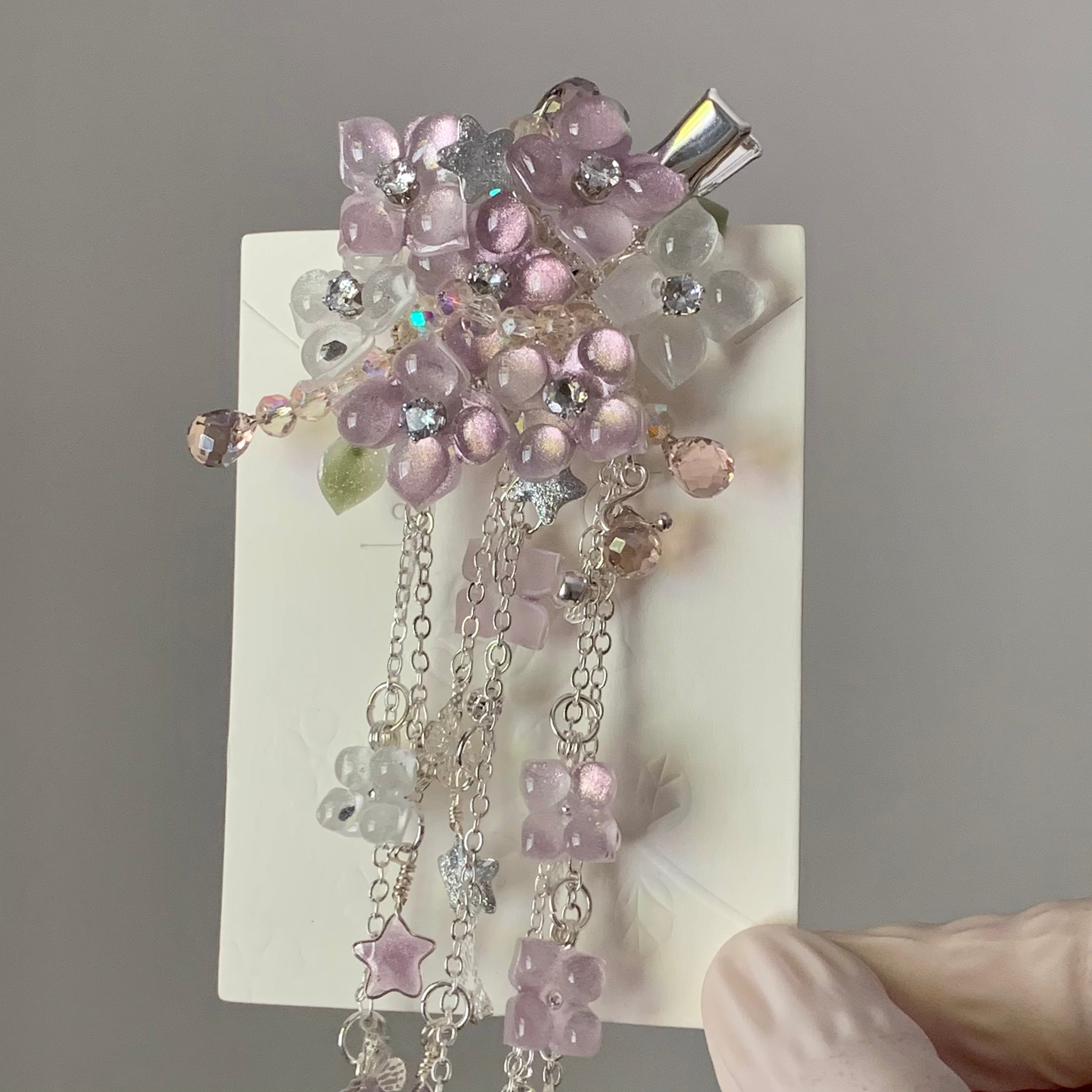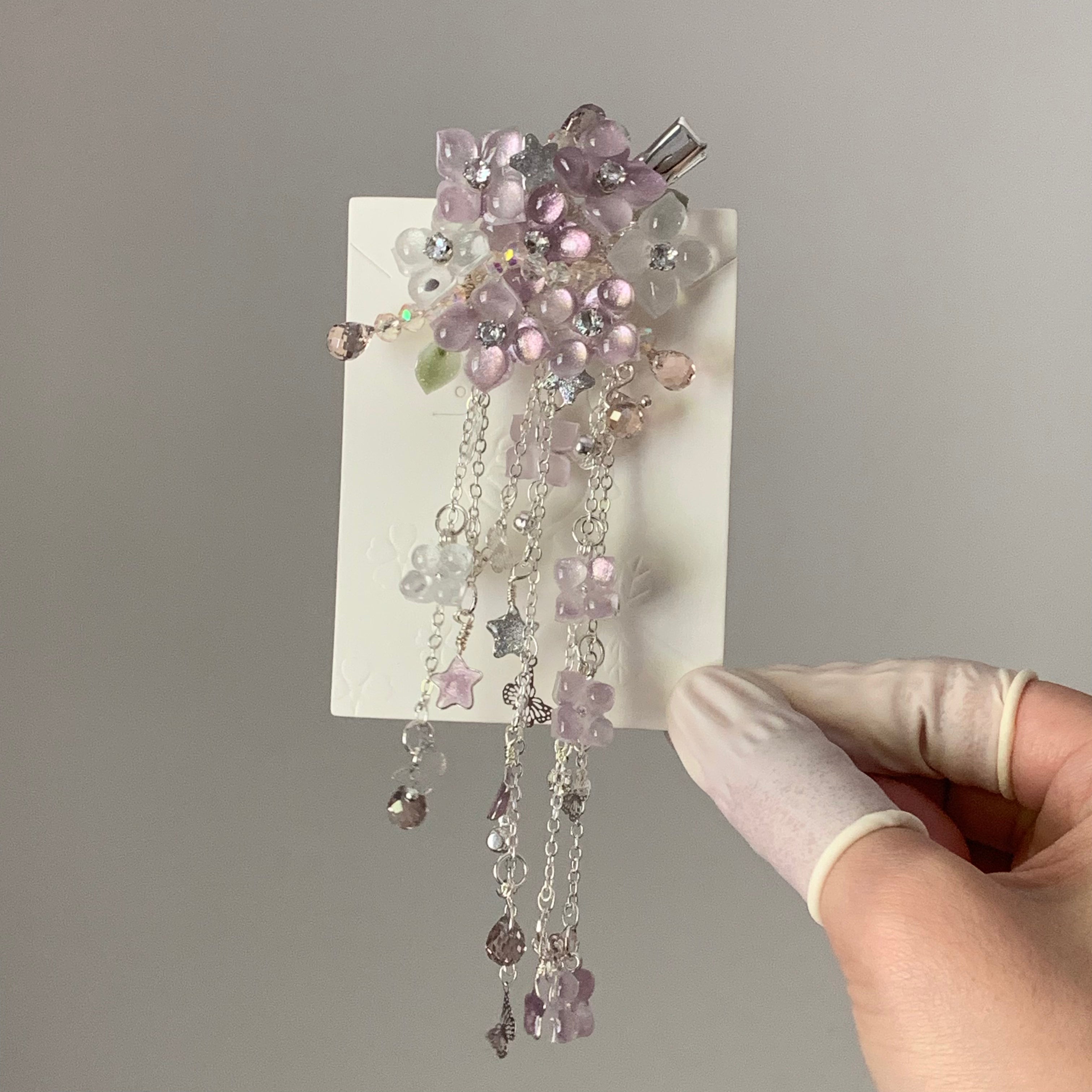 This magical hair clip features soft lavender hydrangeas made from shrink plastic, sprinkled with tiny silver stars 🌟, hand-cut leaves 🍃, and delicate crystal tassels that shimmer as you move ✨👑