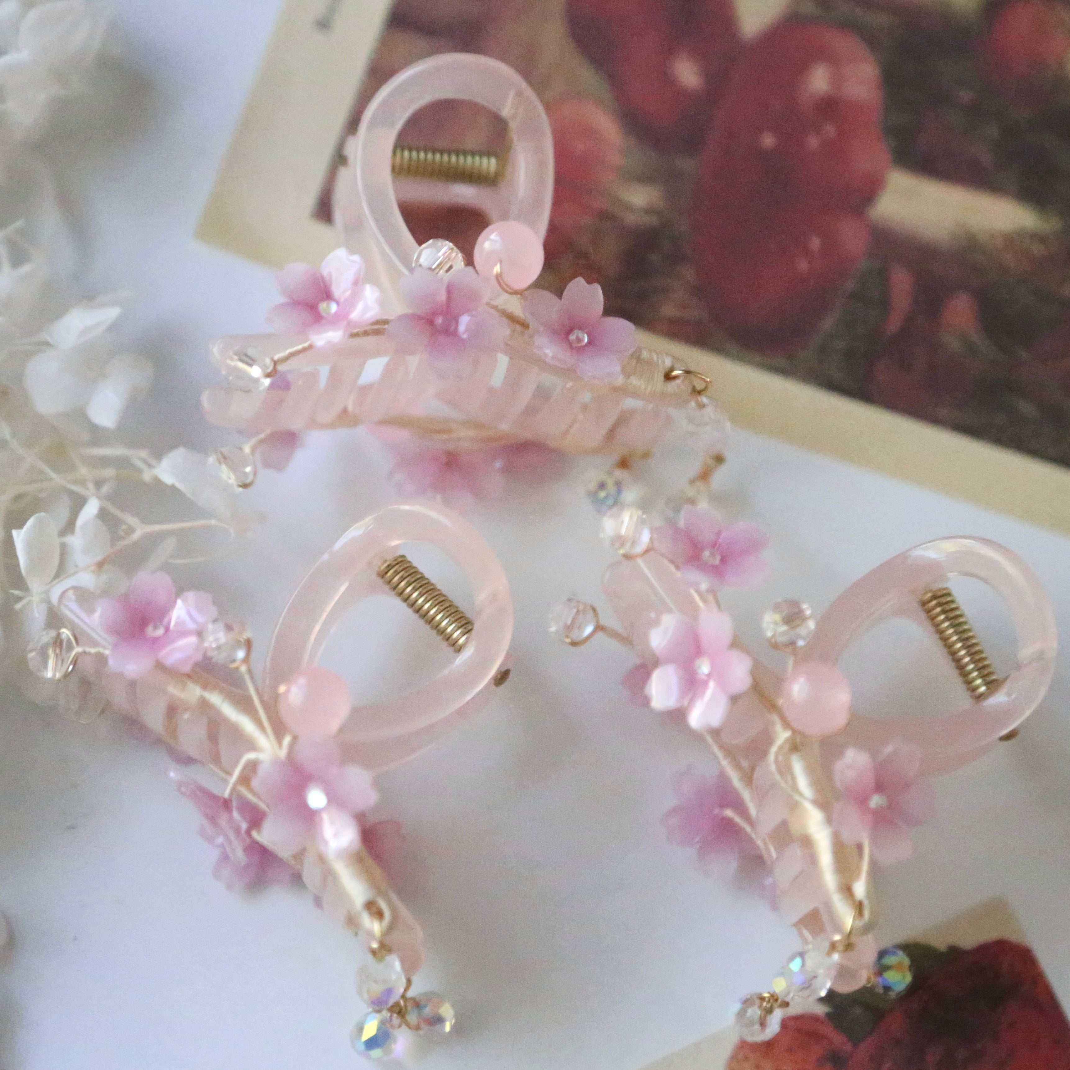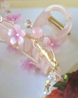 Each side features three cherry blossoms, sparkling crystals, pink beads, and a touch of tassel for extra charm.