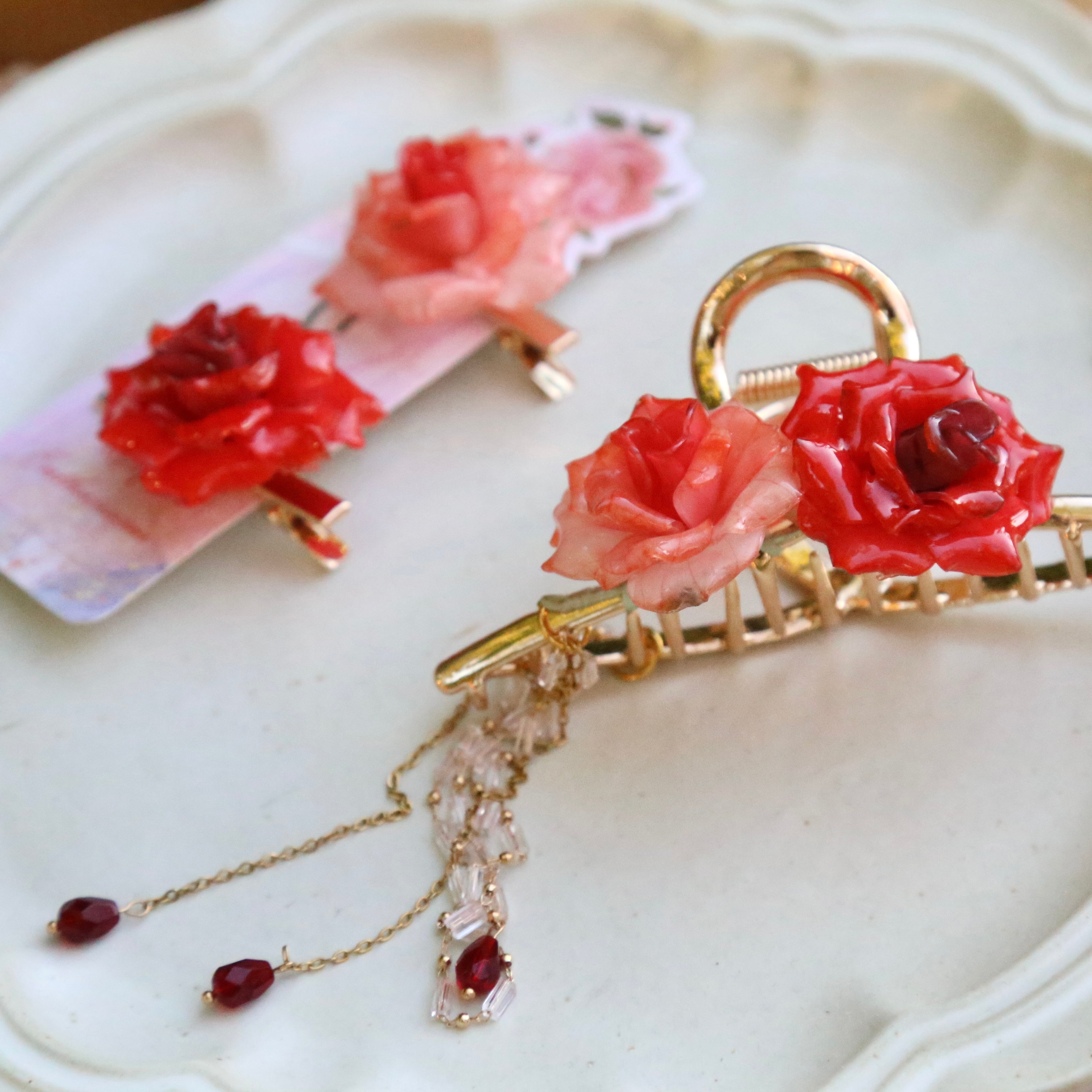Available in two stunning styles—a hair claw adorned with sparkling crystal tassels and a hair clip featuring one pink and one red rose—these accessories showcase intricate and high-difficulty designs that truly stand out. The elegant combination of colors adds a romantic flair, making them perfect for special occasions like parties or events. Experience the beauty and sophistication of these hair accessories, and elevate your look with their captivating charm!