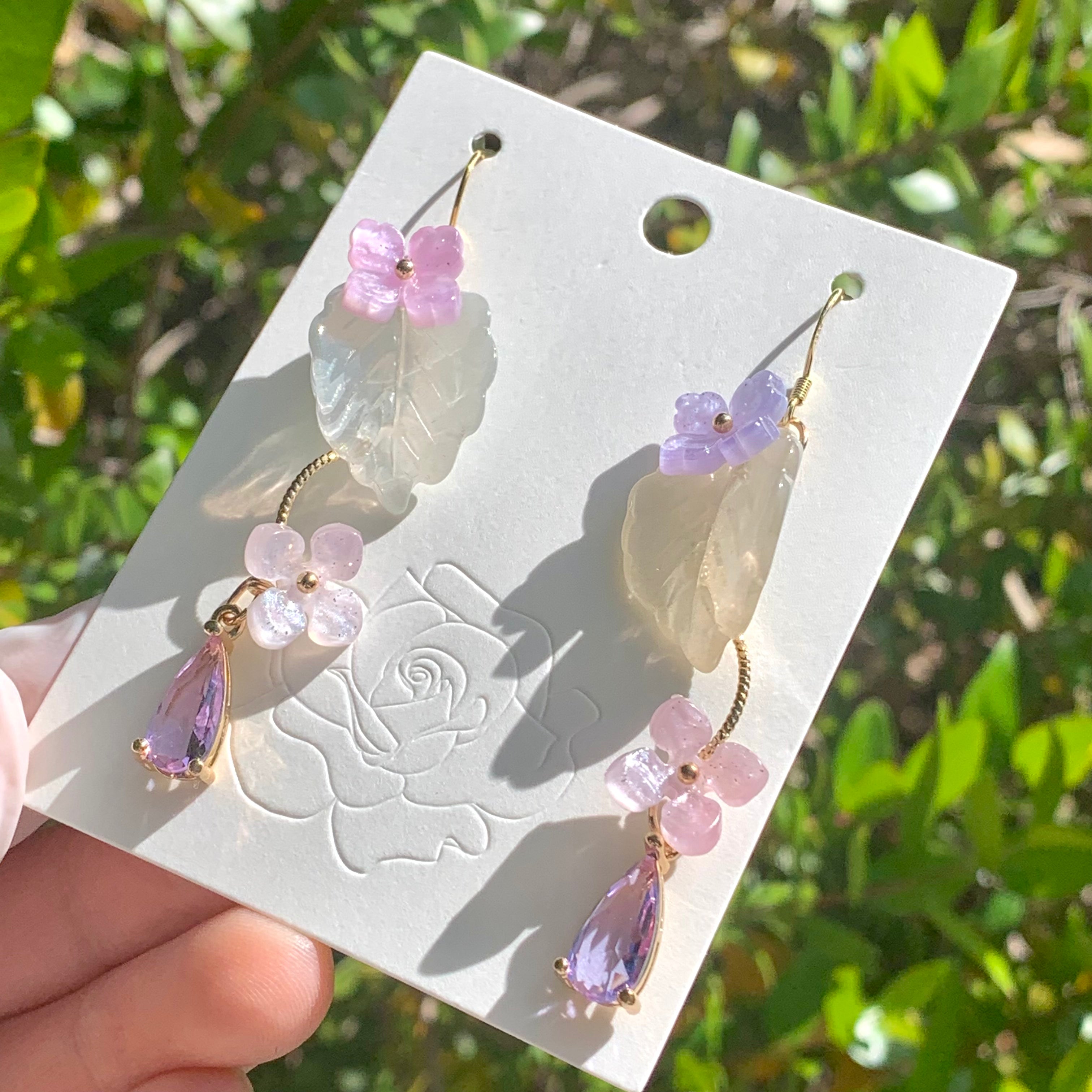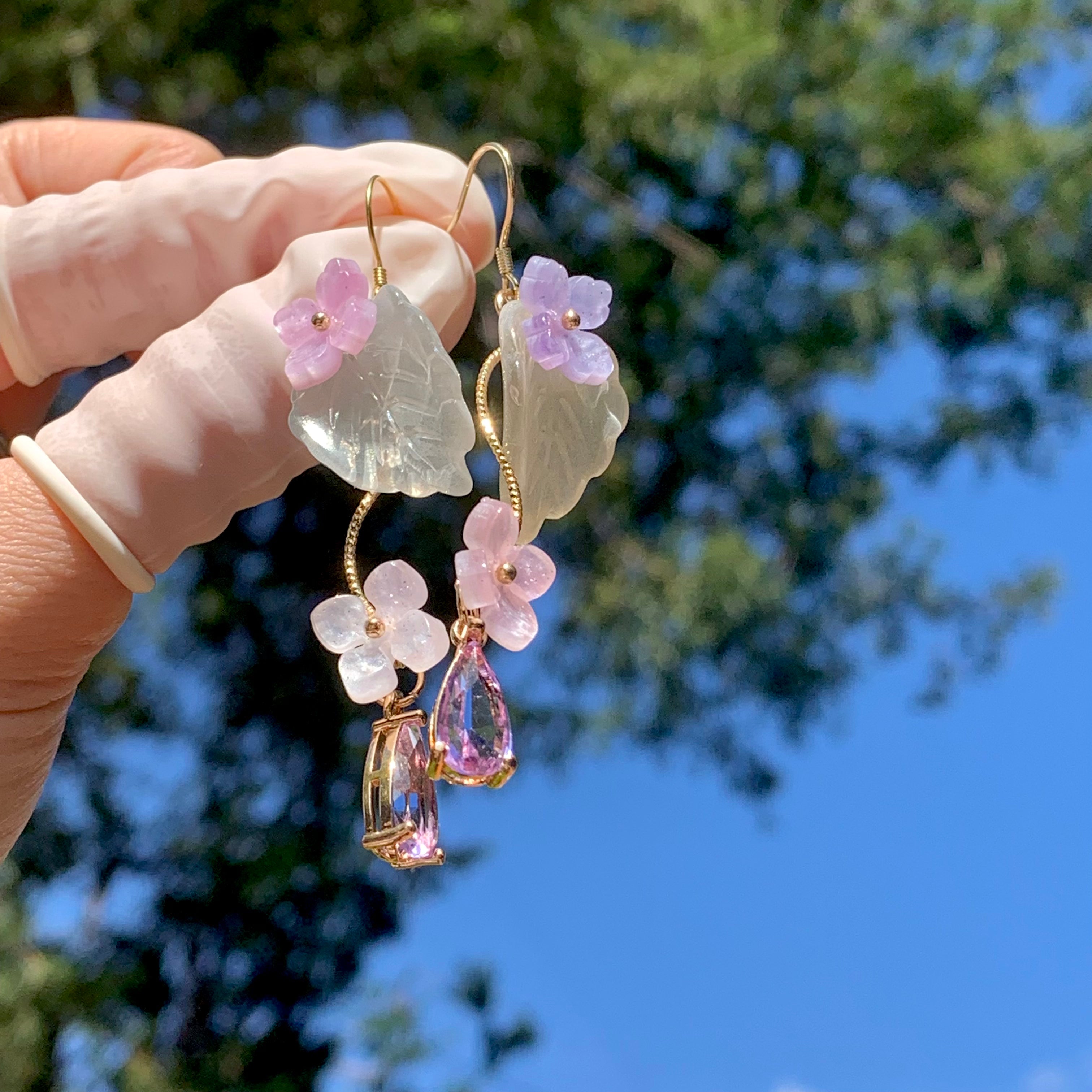 Each pair features soft pink-to-lavender gradient hydrangea beads, each one uniquely colored, paired with shimmering crystals and dainty green leaves. No two earrings are exactly alike — just like real flowers.
