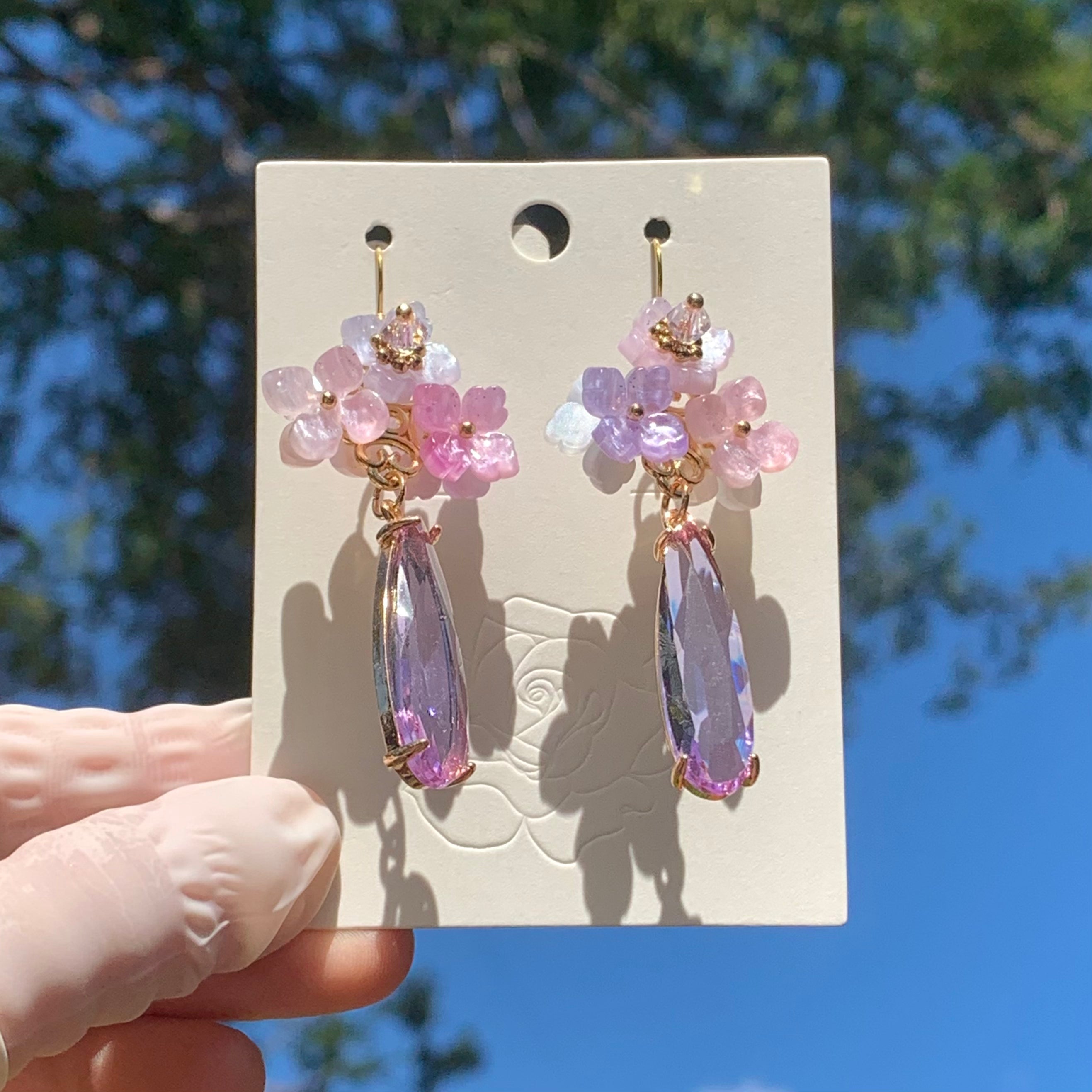 Bloom like a hydrangea 🌸 These fairycore earrings feature clusters of pink and purple gradient flower beads, paired with crystals — super lightweight and hypoallergenic!