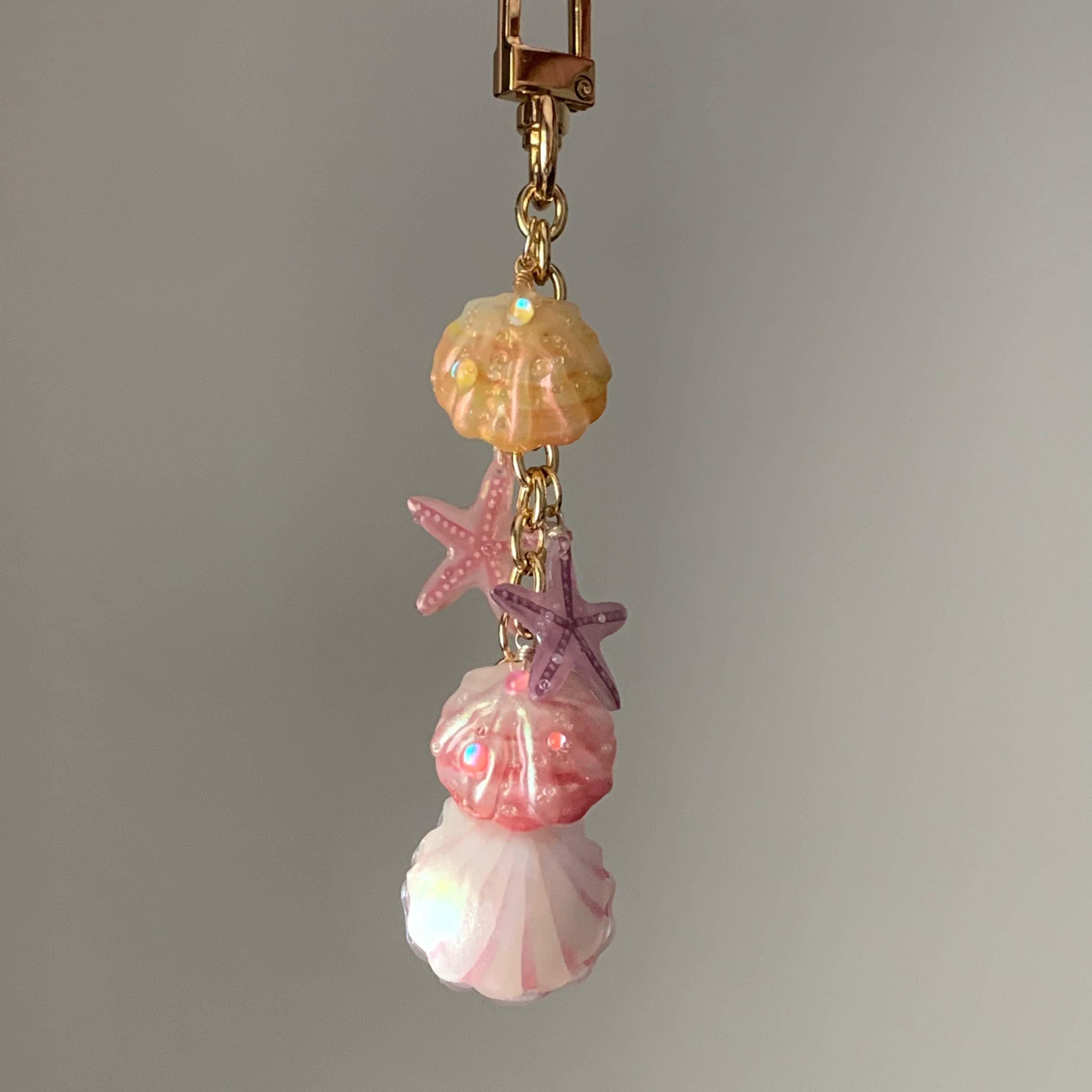 Crafted from shrink plastic, this unique keychain features delicately hand-shaped shells and starfish in dreamy pastel tones. Hidden inside is a tiny, functional bell that gently jingles with movement—adding both charm and sound to your everyday carry. A playful and artisanal summer accessory.