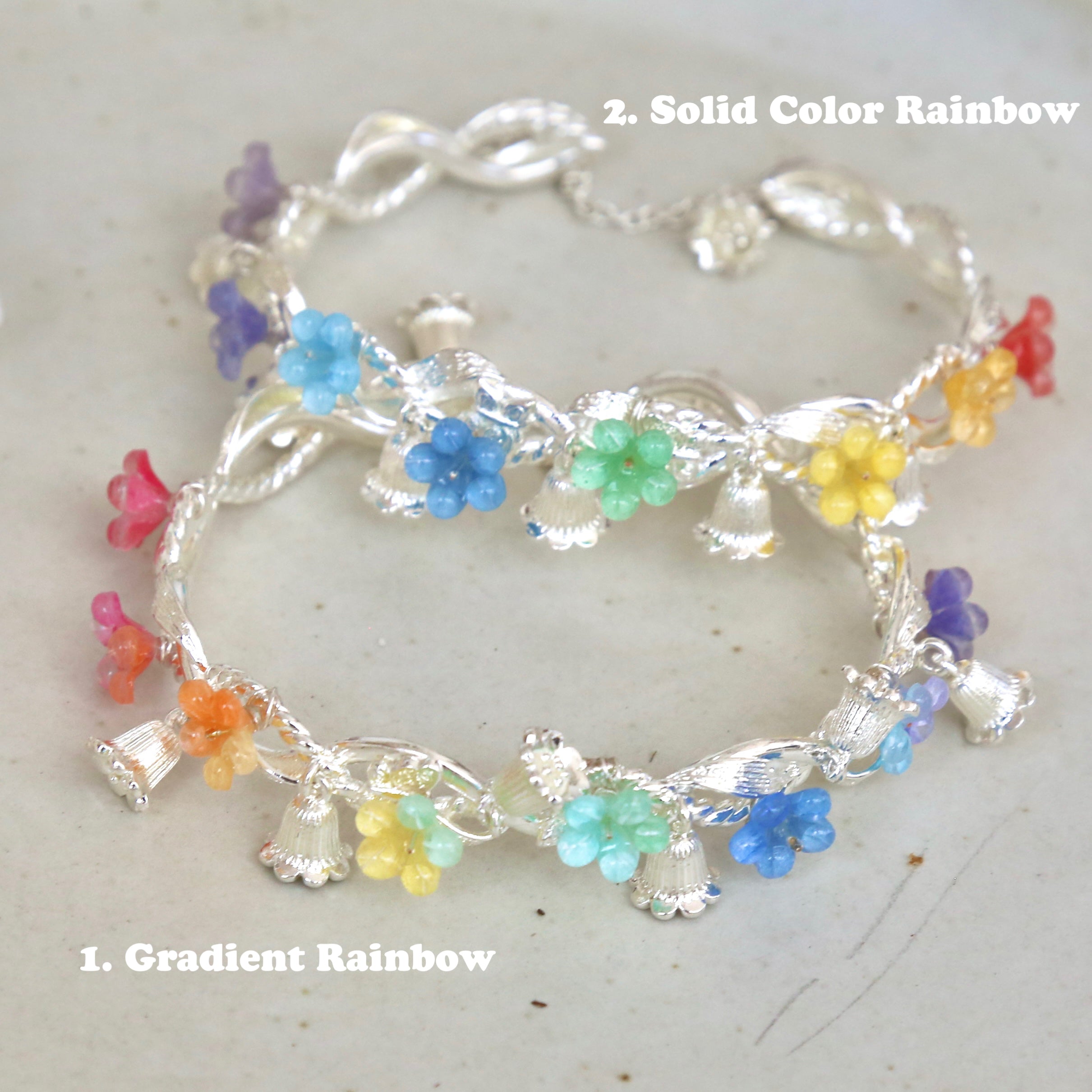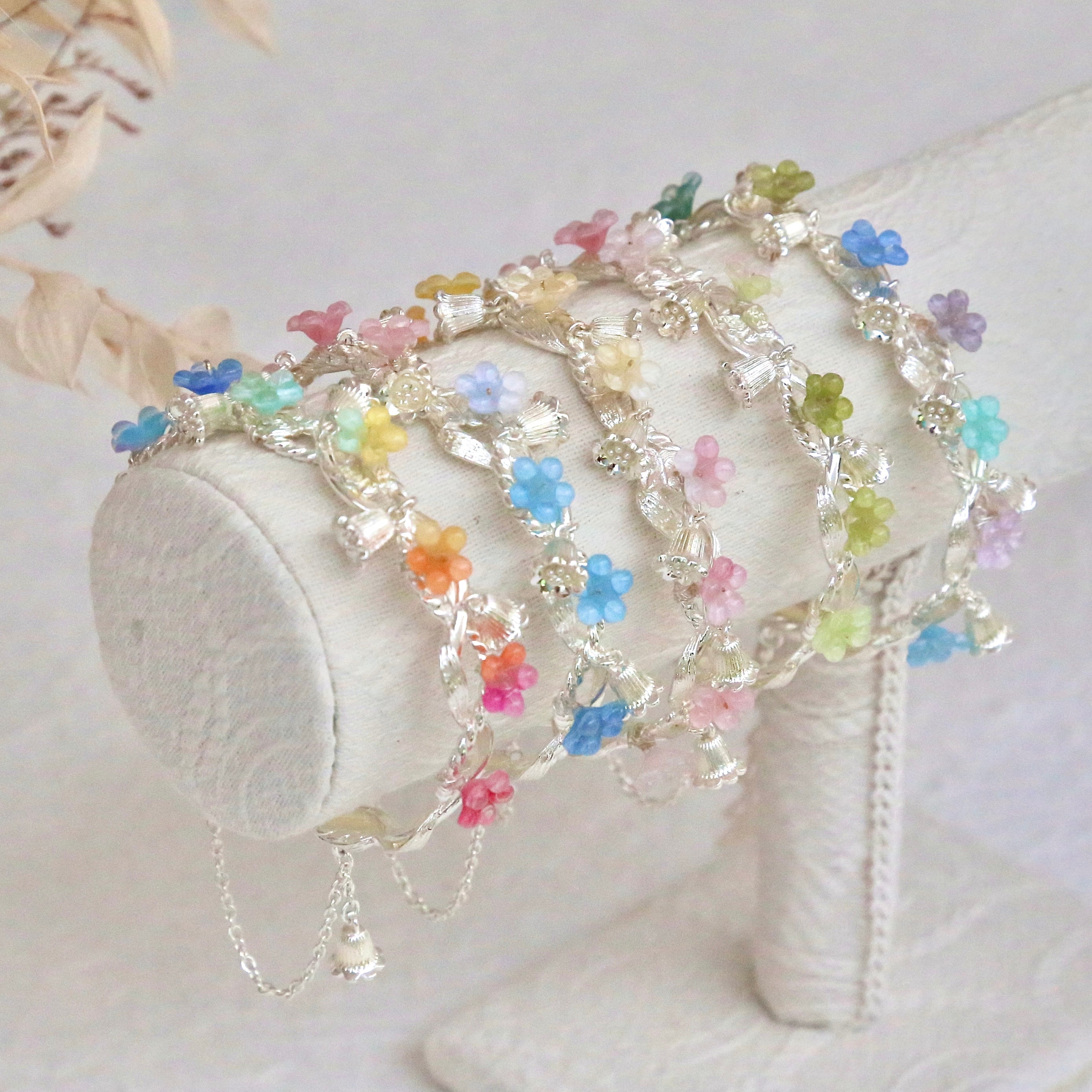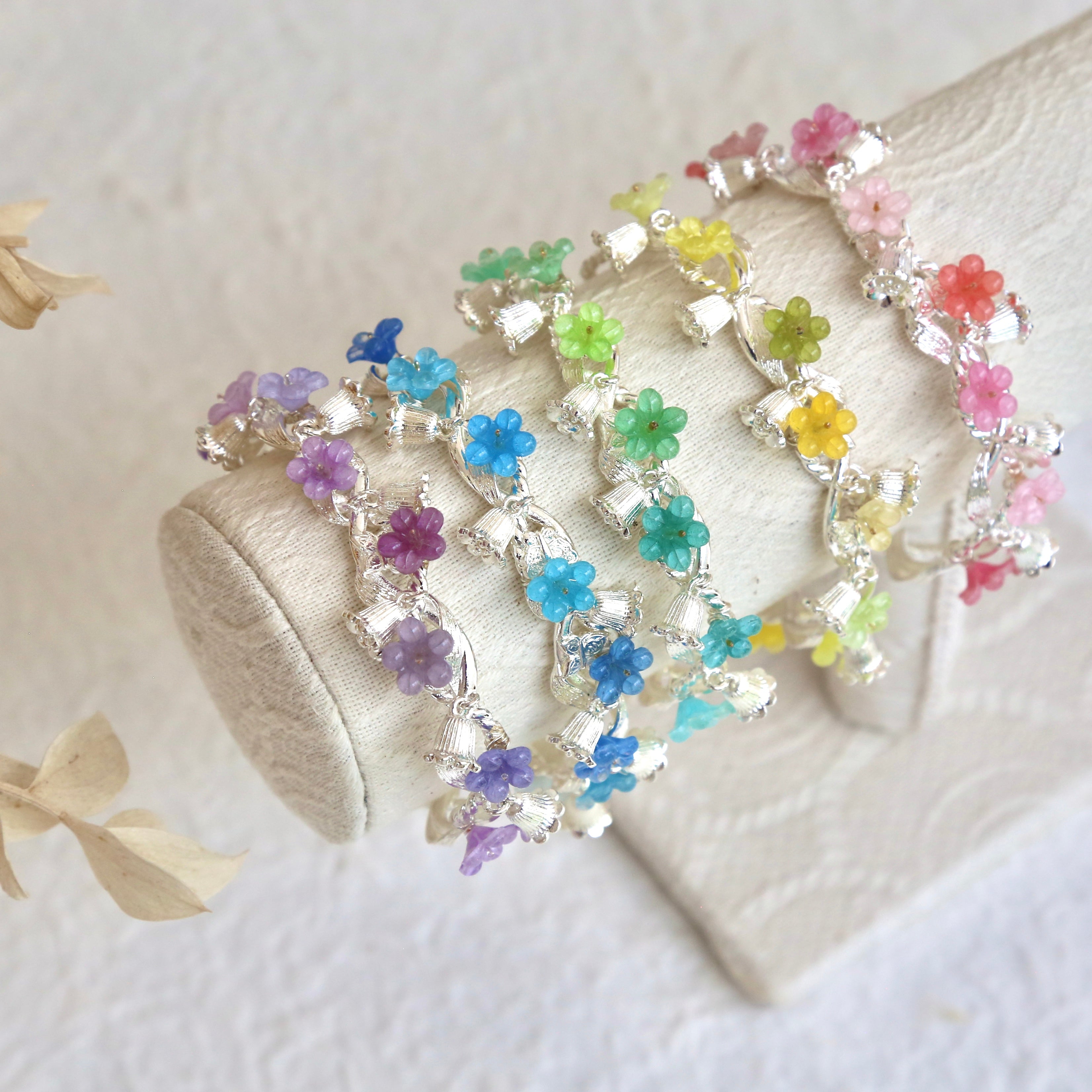 This exquisite bracelet features beautifully crafted silver-plated lily of the valley flowers, adding a touch of elegance. Complemented by vibrant, colorful flowers made from heat-shrink material, this piece offers a playful yet sophisticated charm. Its soft design allows for easy adjustment, ensuring a perfect fit for any wrist size. Embrace style and comfort with this versatile accessory that can elevate any outfit.