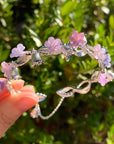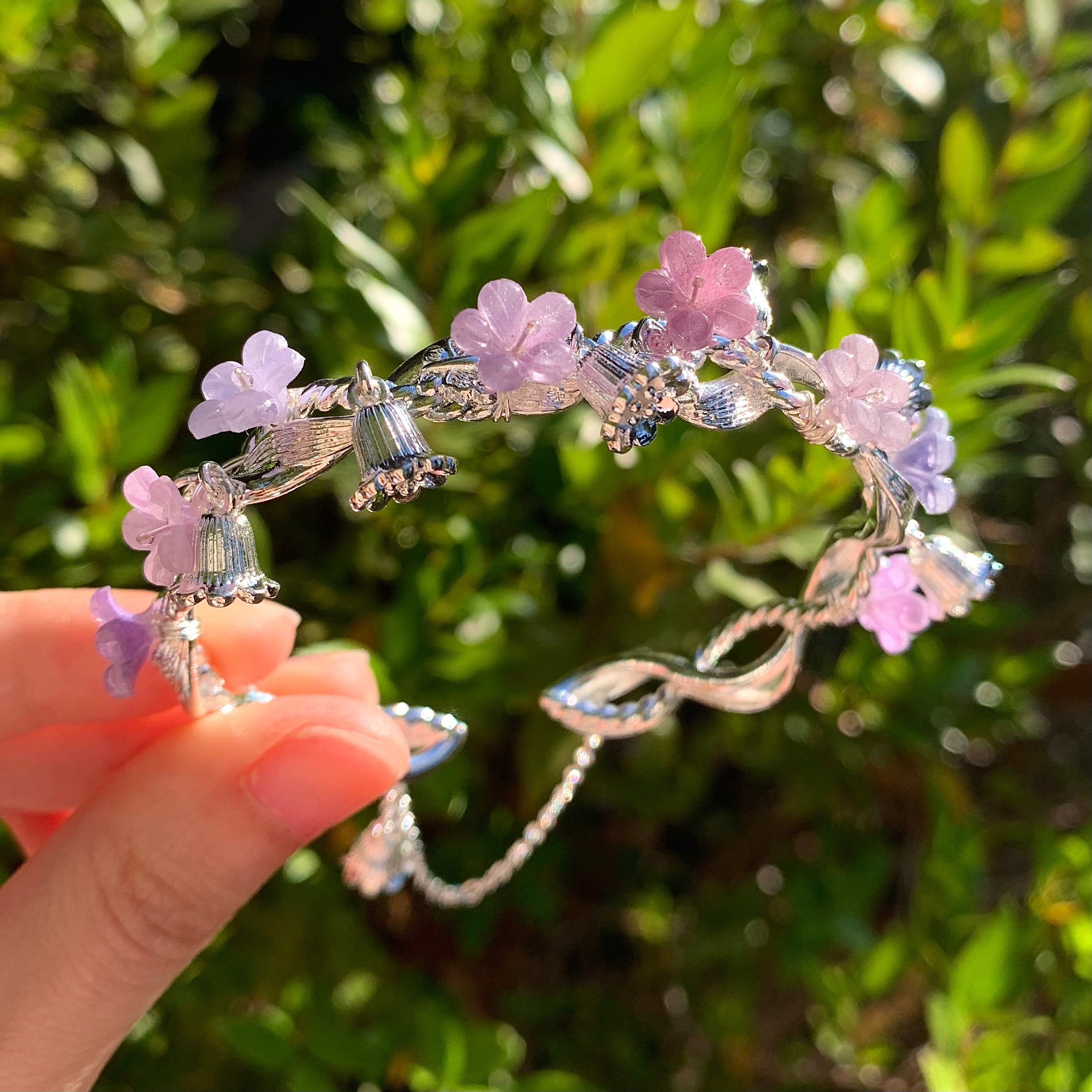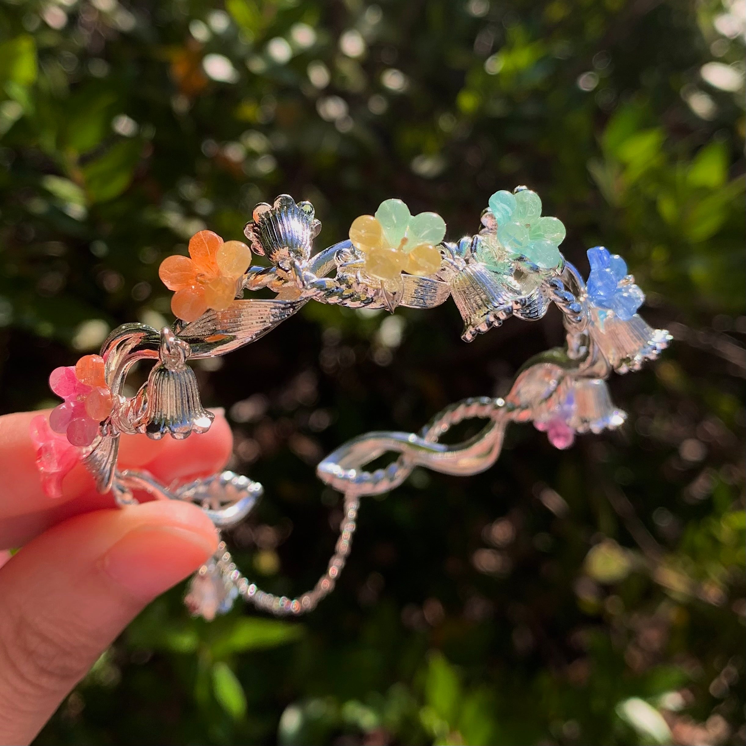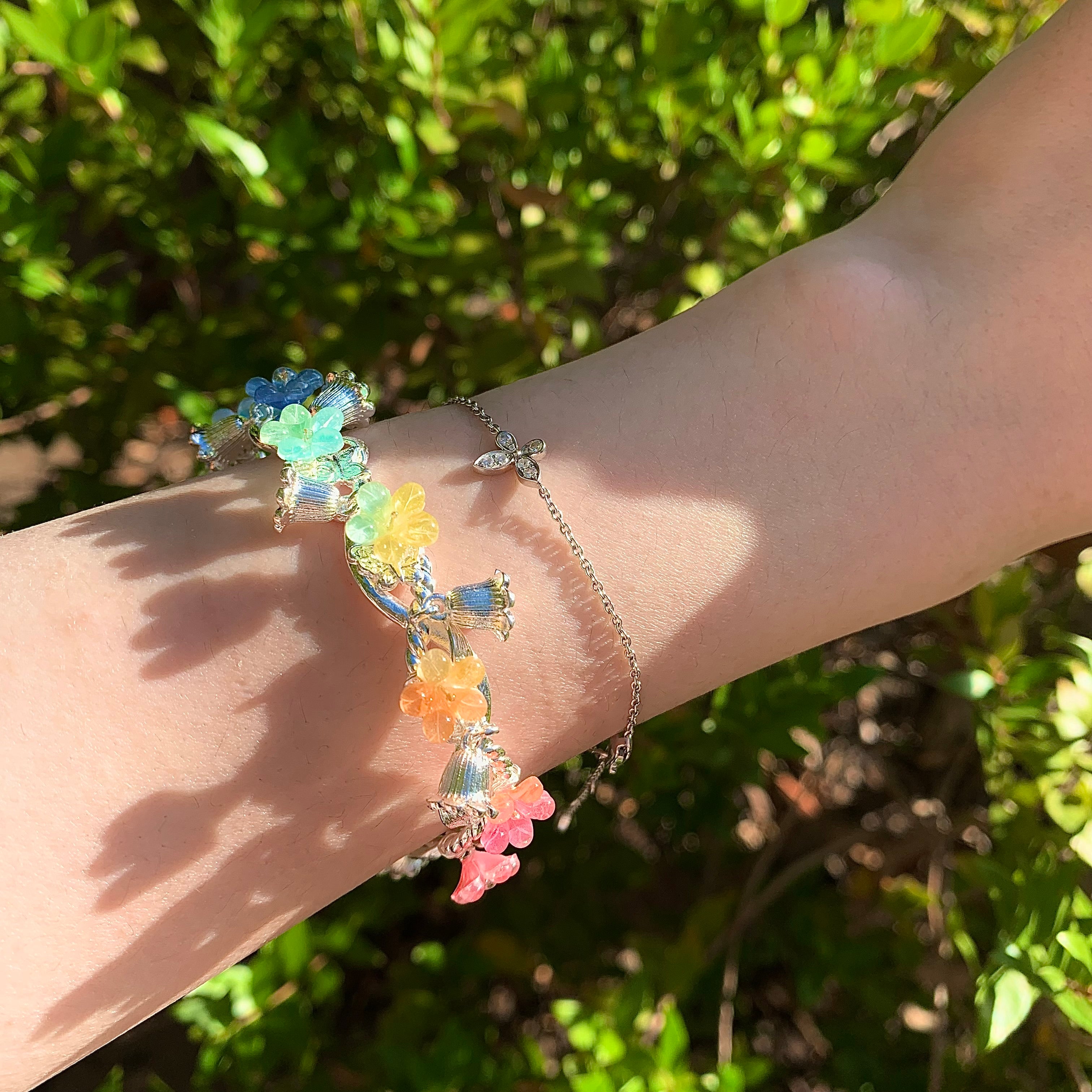 This exquisite bracelet features beautifully crafted silver-plated lily of the valley flowers, adding a touch of elegance. Complemented by vibrant, colorful flowers made from heat-shrink material, this piece offers a playful yet sophisticated charm. Its soft design allows for easy adjustment, ensuring a perfect fit for any wrist size. Embrace style and comfort with this versatile accessory that can elevate any outfit.